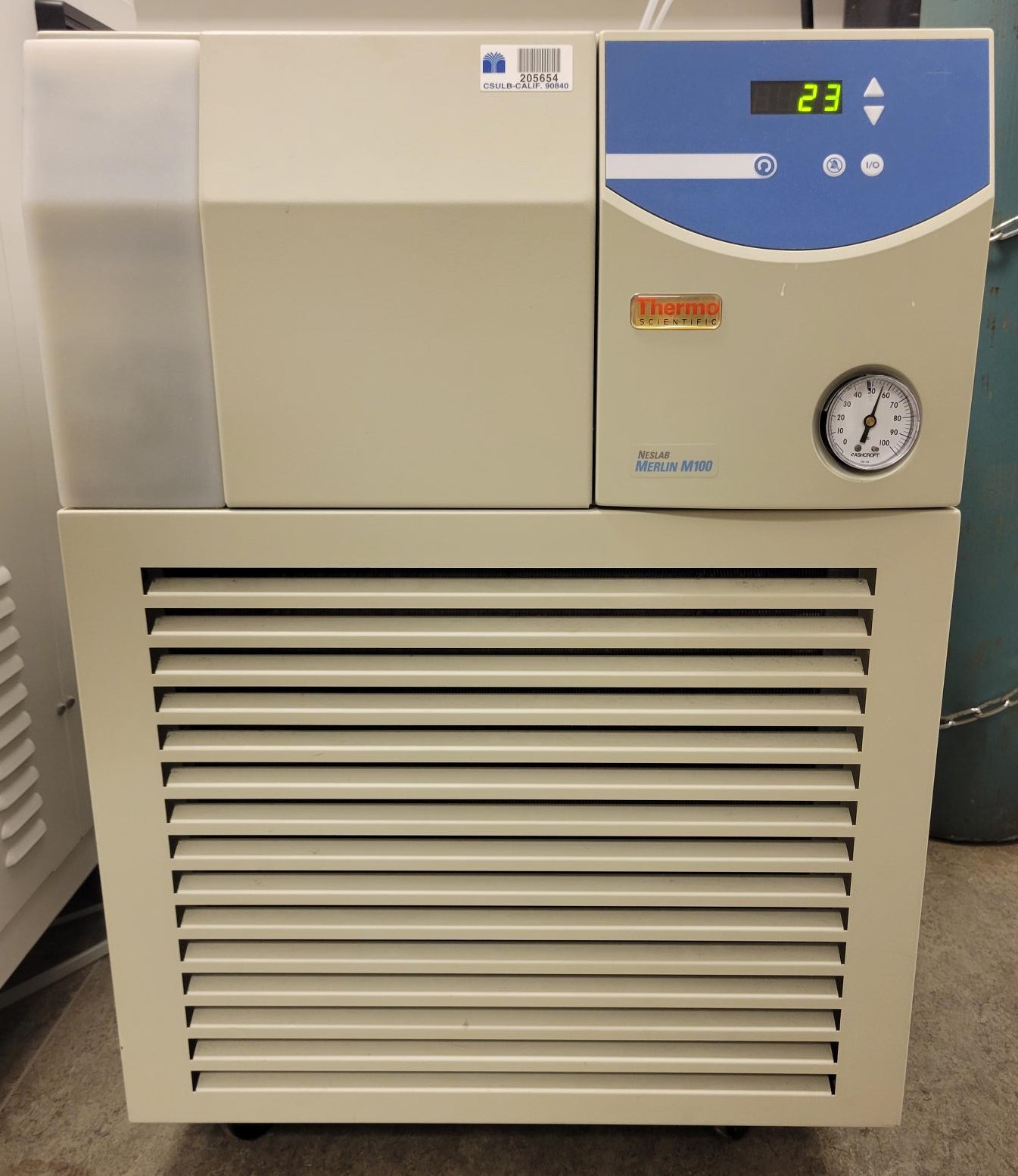 - Turn on the chiller by pressing the “I/O” button on the front. The lights on the front panel will show if the water level is inadequate. Ensure that the pressure gauge on the front is below 60psi and the temperature is below 25C prior to starting the pump down sequence.