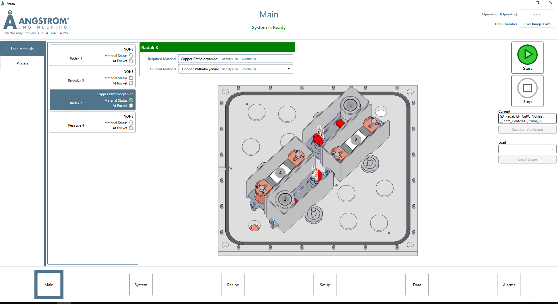 - In the “Main” chiclet, navigate to the Load Materials tab. From the Side menu, select the source location where the deposition material has been placed and select the material from the drop-down menu. Click the Process tab and load the desired deposition recipe on the right drop-down menu. All recipe layers will populate the tab.