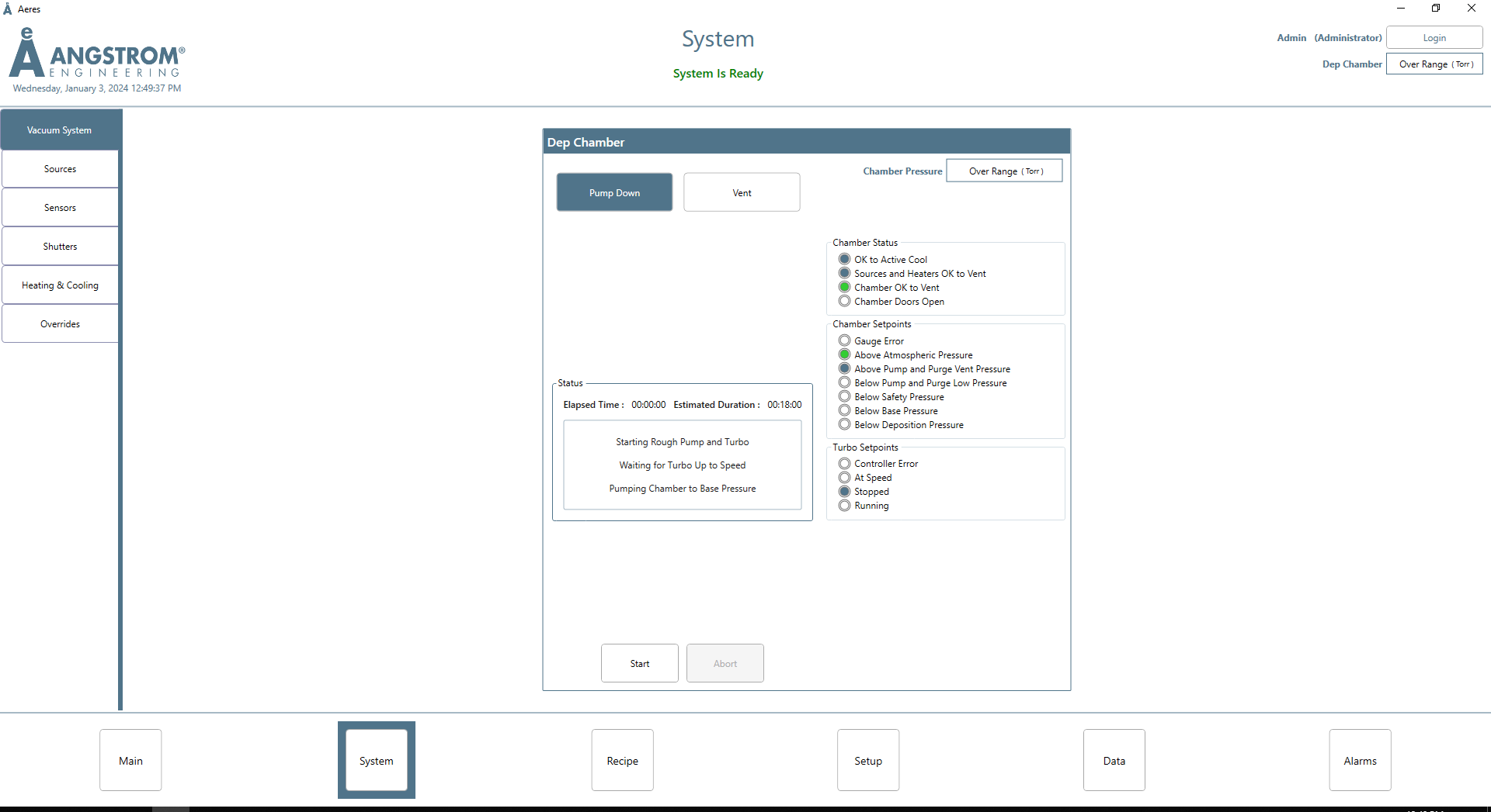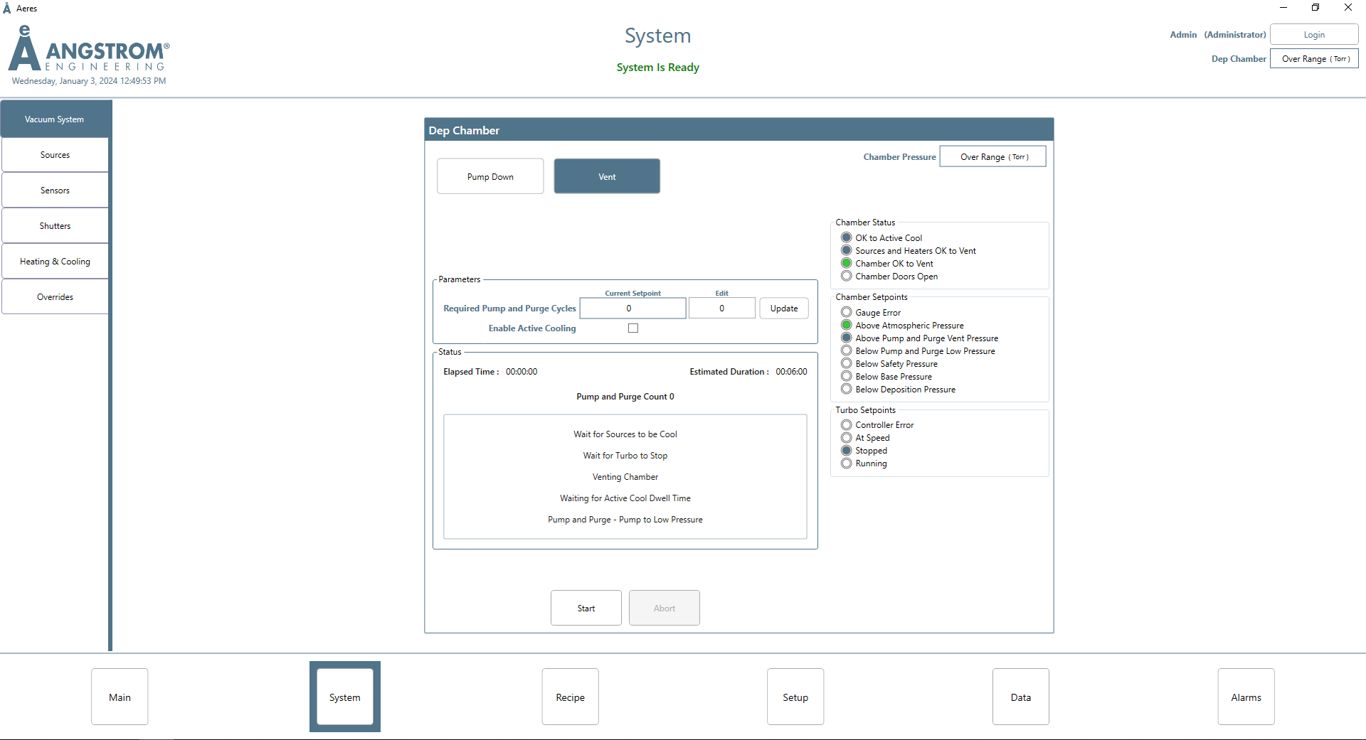 AeresStartupSoftware and log into the assigned user.If the deposition chamber pressure reads “Over Range (Torr)”, the deposition chamber is not pressurized and is able to be opened. If deposition chamber pressure reads any value, depressurize the chamber by selecting the “System” chiclet, selecting the “Vacuum System” tab and starting the “Vent” process as shown below.