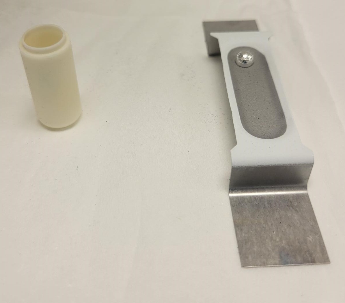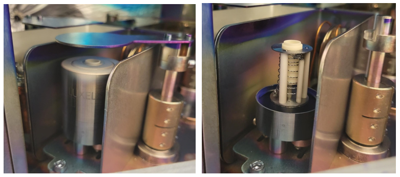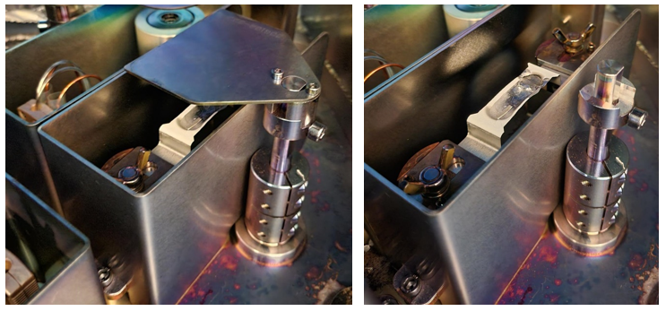 - CAUTION: The lip of the radak will poke out of the baffle opening as shown in the image below. Replace the baffle by lining up the prongs and turning counterclockwise until the prongs drop into the track. Turn the baffle clockwise to tighten and replace the source shutter.