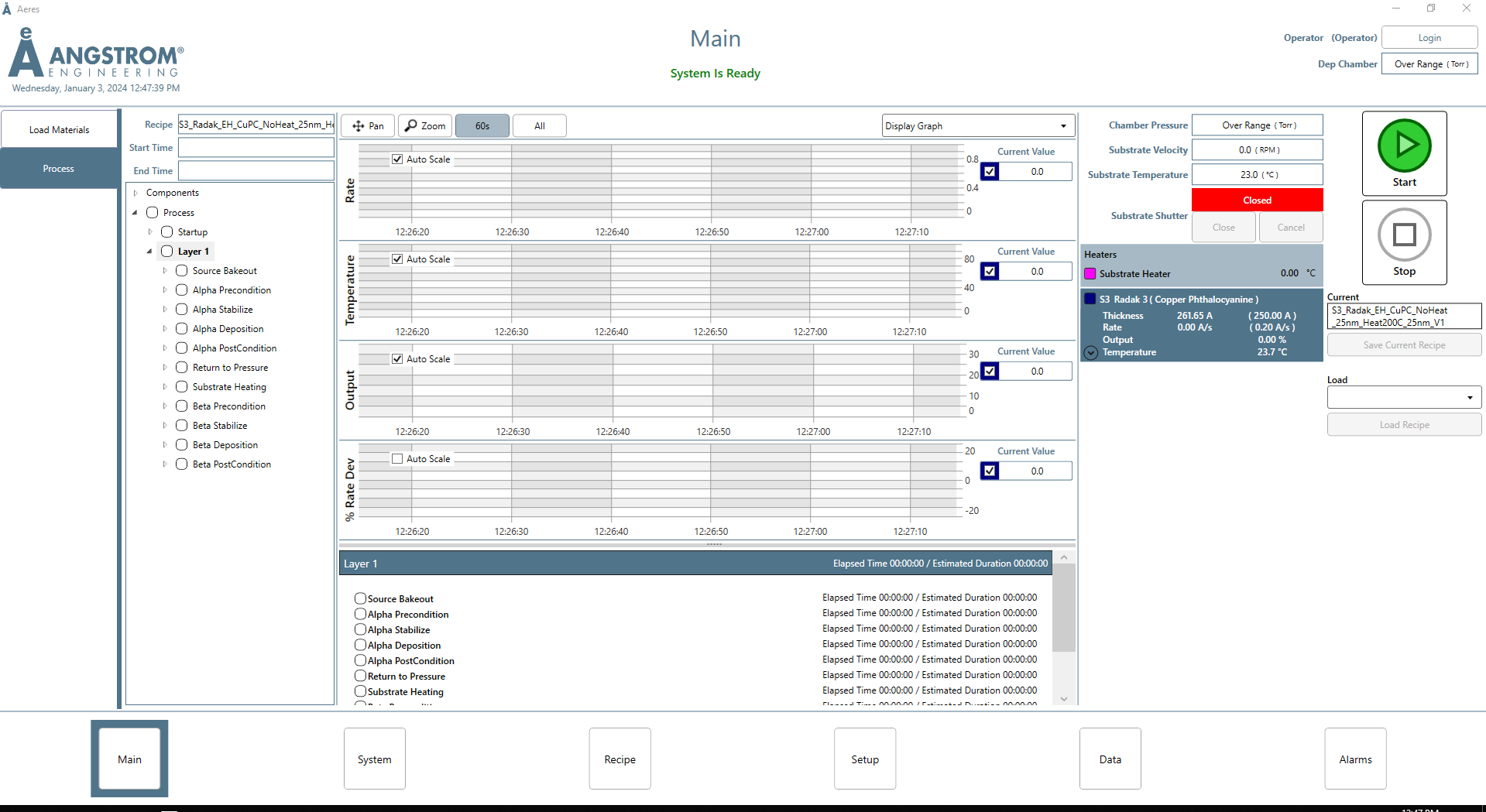 - During the deposition process, the deposition rate, source temperature, power output, and % Rate deviation are shown in the real time data viewer panel within Process tab in the “Main” chiclet.